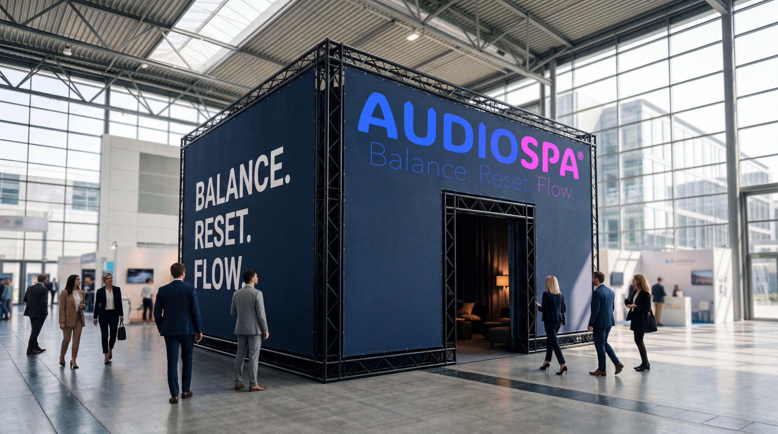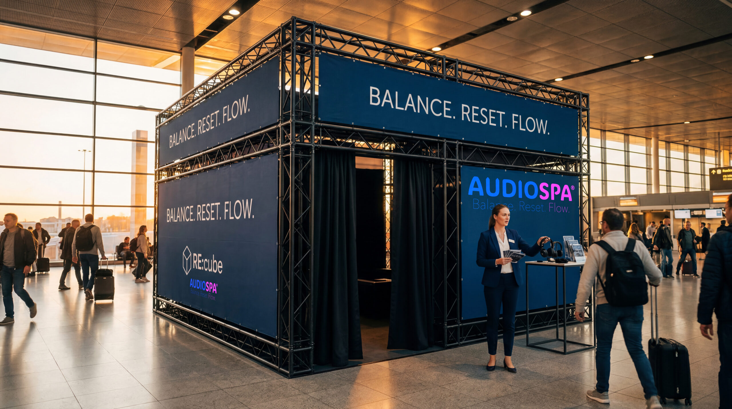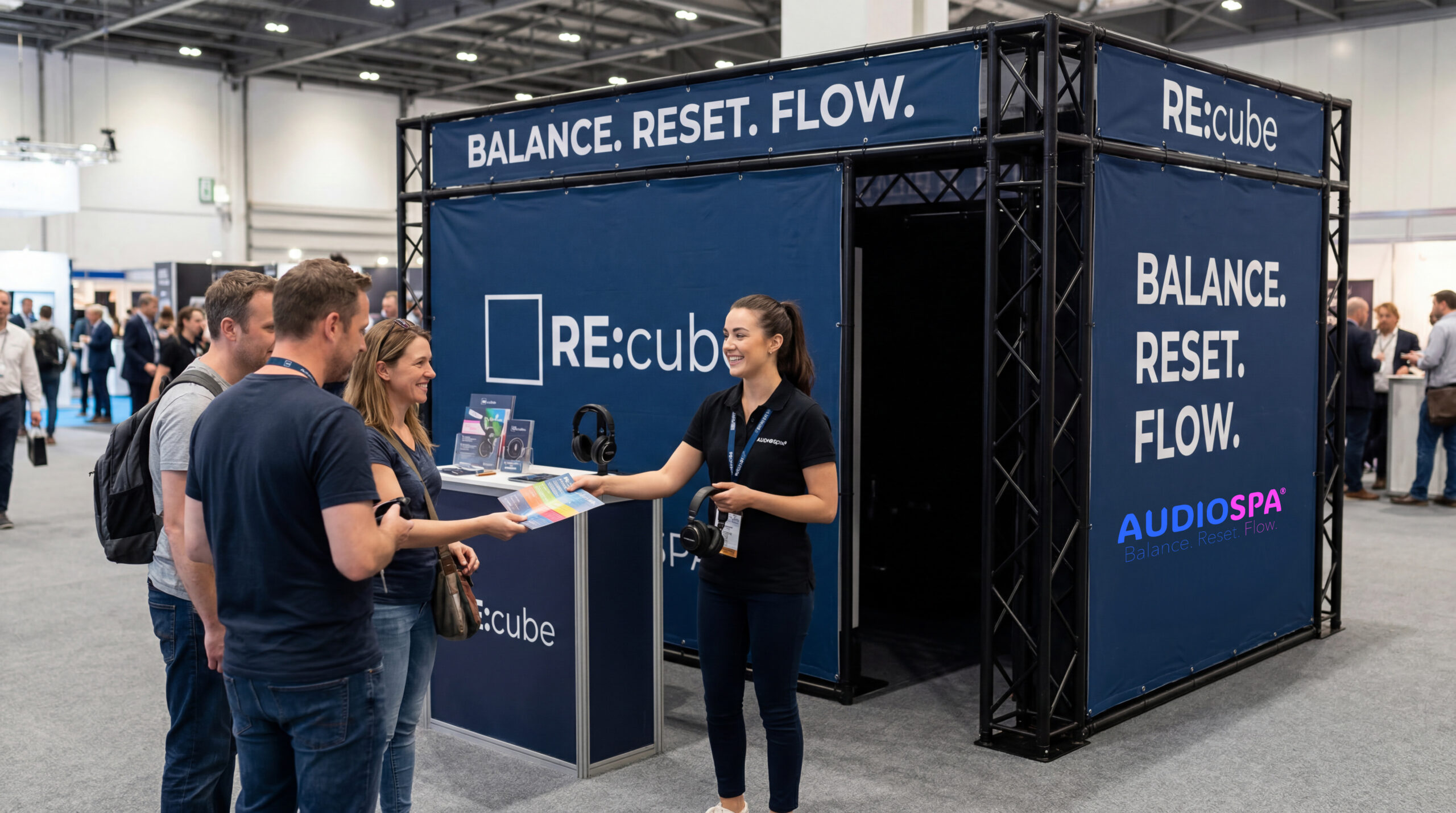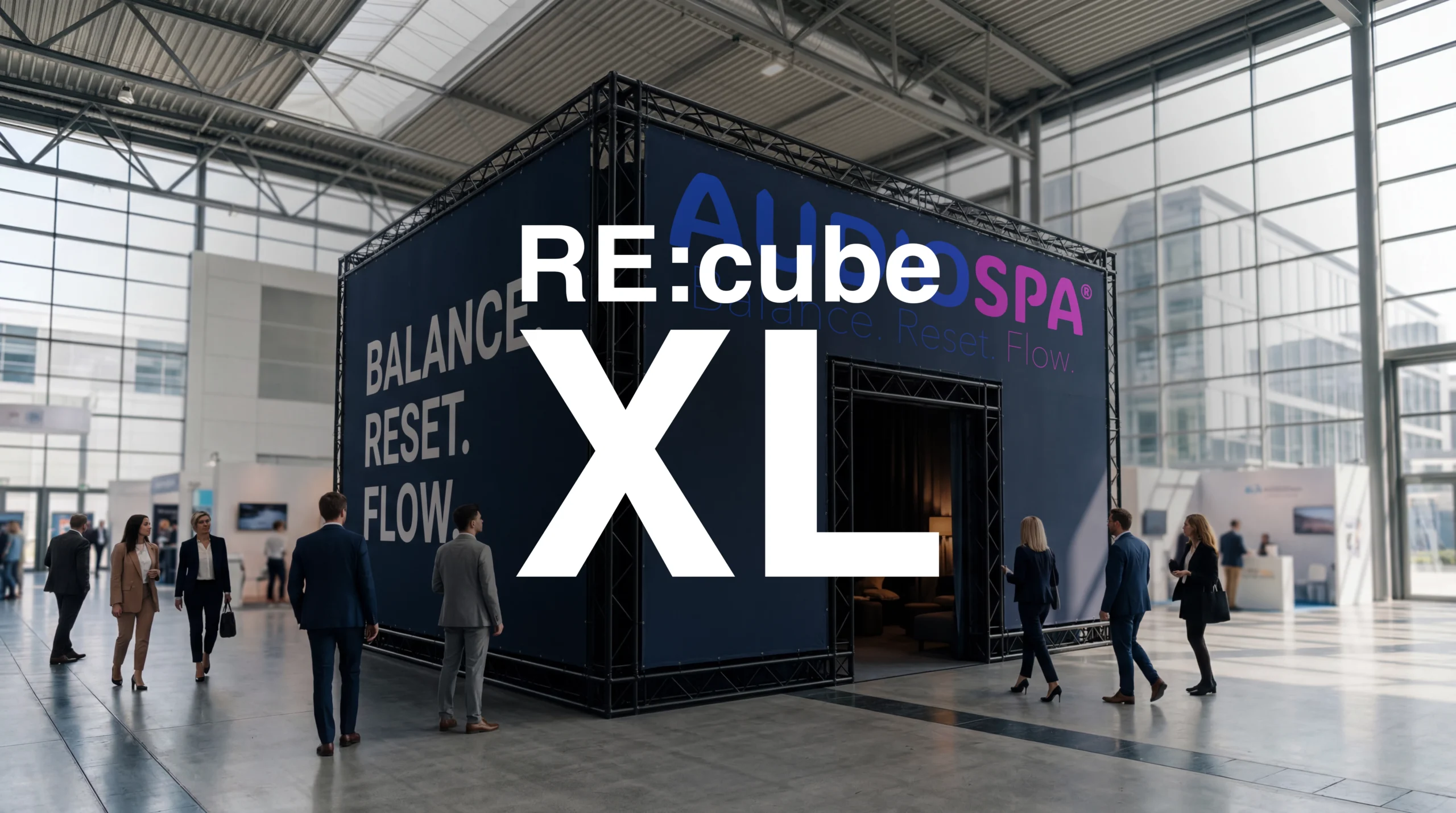 Die Weltneuheit AUDIOSPA® RE:cube ist der Platz für Ruhe und neue Energie. In rund 20 Minuten erfahren die Gäste im bequemen Designer-Setting audiovisuelle Tiefenentspannung und motivierenden Flow, wissenschaftlich untermauert. Audiospa garantiert einfach guten Drive für Messe, Kongress, Workshop und Unternehmen. Vielfach erprobt – als Kinoformat, auf Social Media und als After-Work-Event. Der innovative Weg »in einen Zustand der tiefen Entspannung.«
