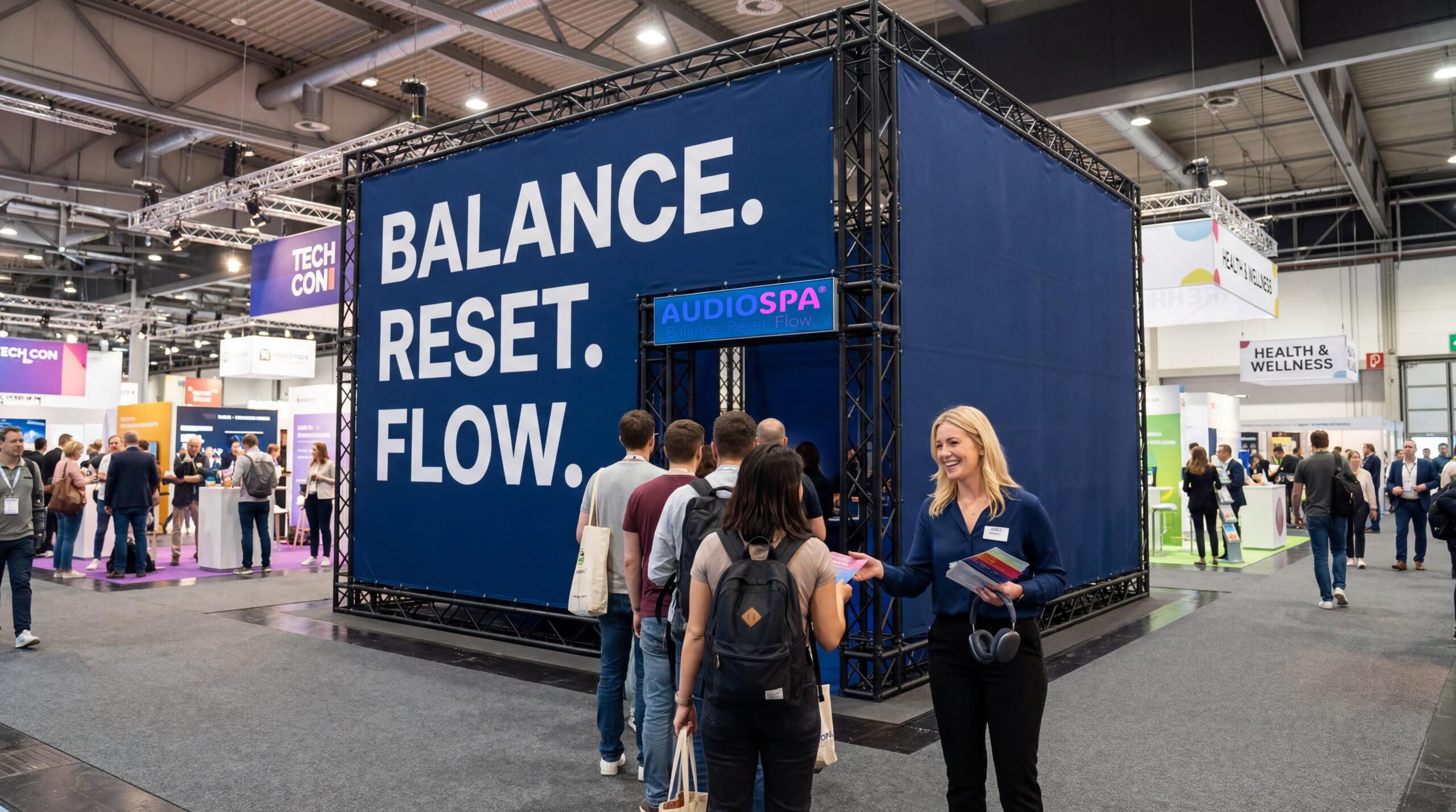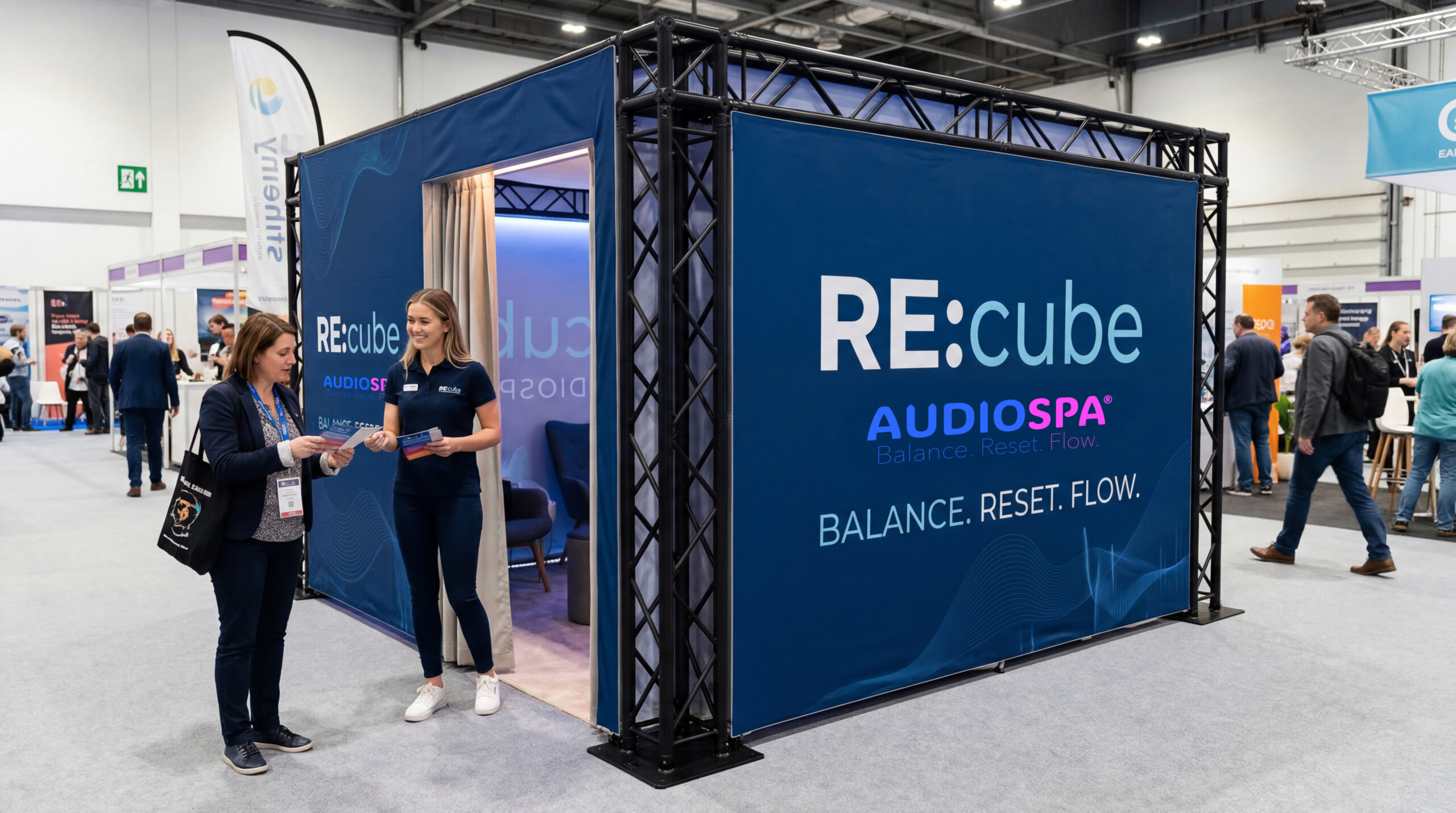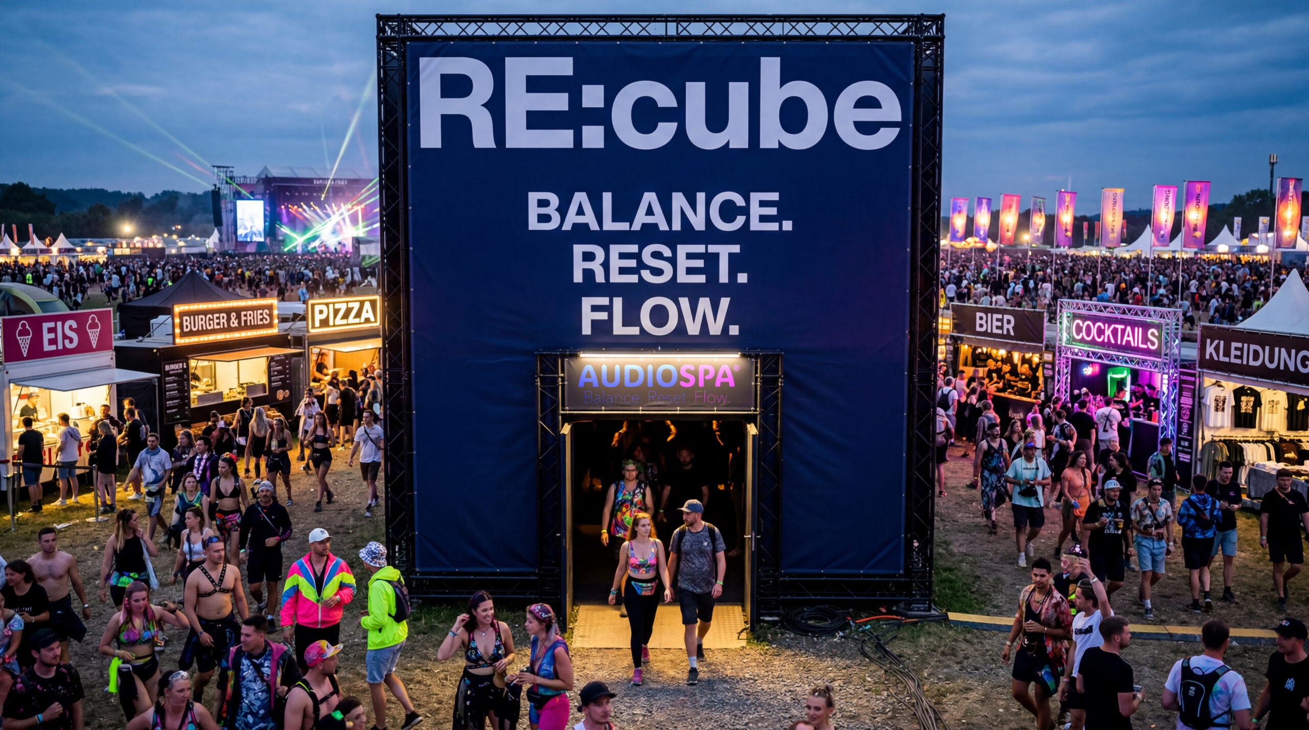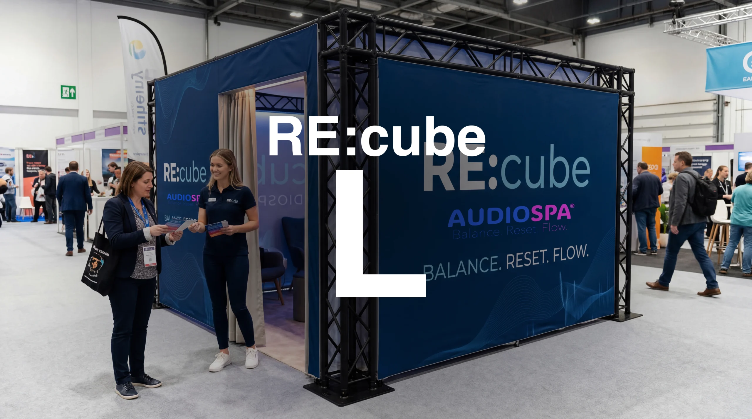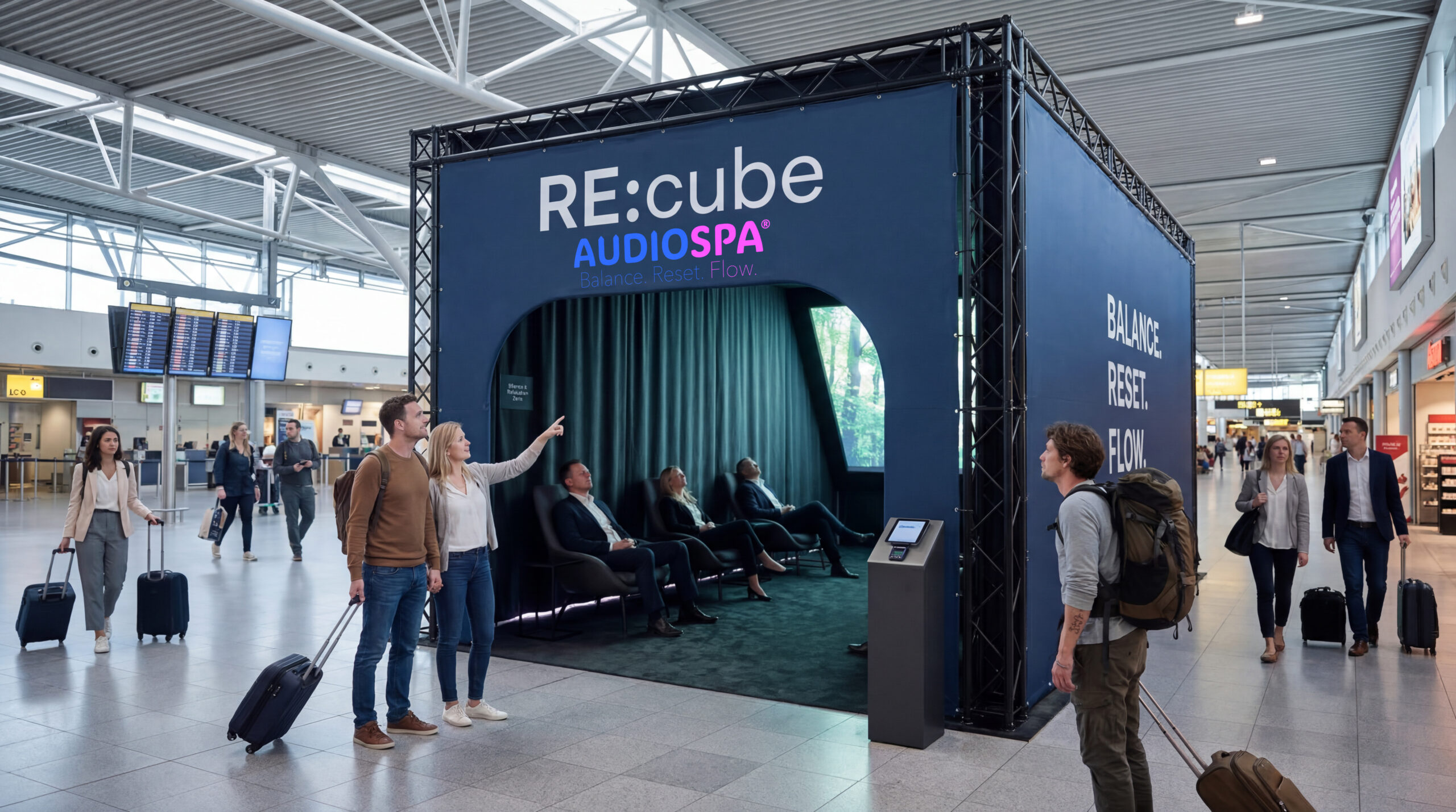 Die Weltneuheit AUDIOSPA® RE:cube ist der Platz für Ruhe und neue Energie. In rund 20 Minuten erfahren die Gäste im bequemen Designer-Setting audiovisuelle Tiefenentspannung und motivierenden Flow, wissenschaftlich untermauert. Audiospa garantiert einfach guten Drive für Messe, Kongress, Workshop und Unternehmen. Vielfach erprobt – als Kinoformat, auf Social Media und als After-Work-Event. Der innovative Weg »in einen Zustand der tiefen Entspannung.«